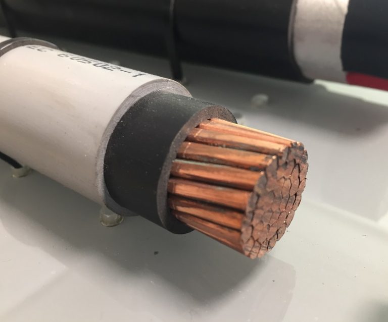 تصویر 1 : کابل افق البرز سایز ۱ در ۲۴۰ ، دور هادی های مفتولی استرند شده ( تابانده شده دور هم ) ، دو لایه روکش کشیده شده که یکی روکش عایقی و دیگری ژاکته – هادی کابل هم از نوع نیمه افشانه ( زمینی یا خشک ) – توجه : مفتولی تنها یک رشته است، اما اینجا چند رشته مفتول مسی دور هم تابیده شدند = نیمه افشان