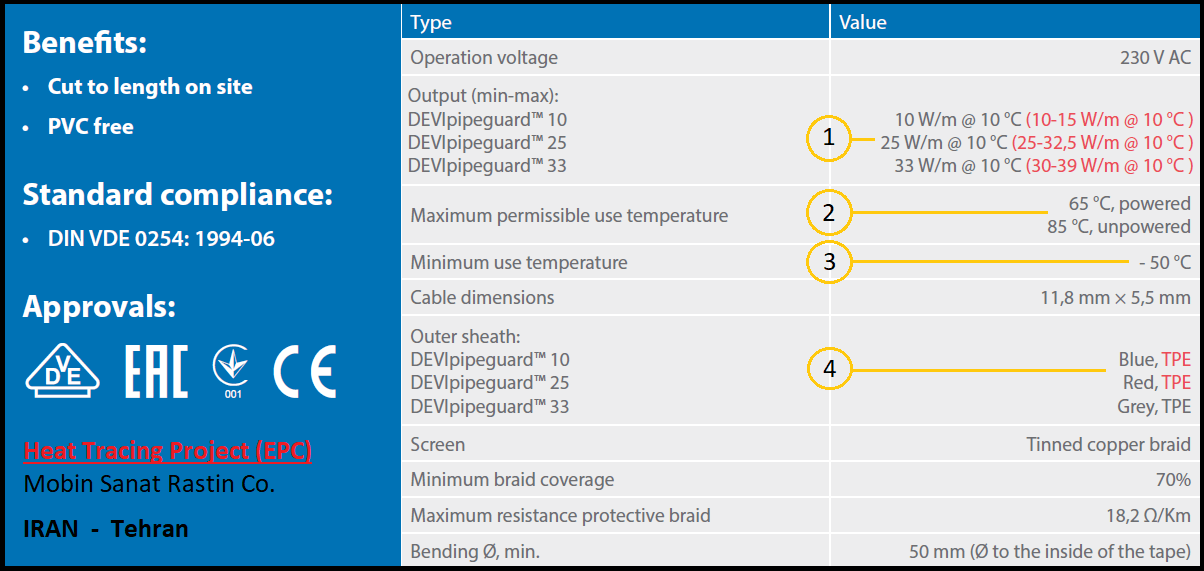حال که کارکرد کابل هیت تریسینگ خود تنظیم را مورد بررسی قراردادیم. به طور خلاصه، به برخی از مشخصات ان نیز اشاره خواهیم کرد. برای فهم بهتر مطالب، یک بخش از کاتالوگ کابل هیت تریس DEVI در زیر آمده است (DEVI یکی از تولید کنندگان برتر هیت تریسینگ در اروپا و از زیر مجموعه های شرکت بزرگ Danfoss می باشد.)
