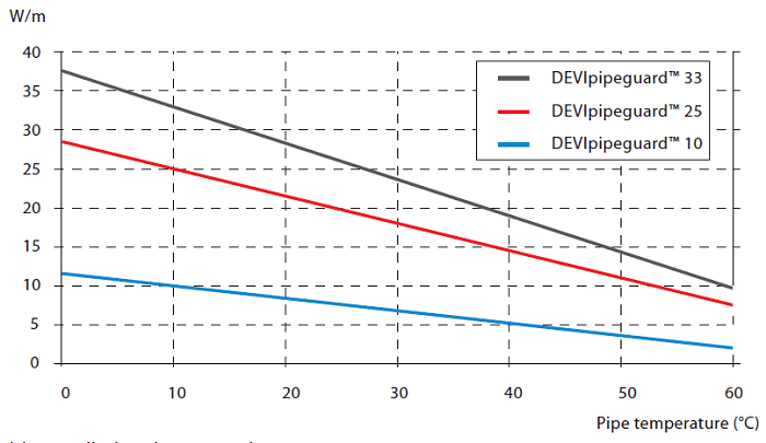 توان درج شده بر روی کابل هیت تریسینگ خودتنظیم ، در واقع توان خروجی کابل هیت تریس در دمای معمول نگهداری ( معمولا 10 درجه ) می باشد. به عنوان مثال همانطور که در نمودار توان – دما که در بخش قبل به آن پرداختیم مشخص است، کابل هیت تریس DEVI 10w/m (وات بر متر) در دمای 0 درجه دارای توان 12 وات بر متر و در دمای 60 درجه دارای توانی معادل 2w/m می باشد. شایان ذکر است که برای کابل مذکور توان 10w/m بر روی کابل حرارتی درج شده است. ( که طبق کاتالوگ ، توان کابل هیت تریس self regulate در دمای 10 درجه است.)