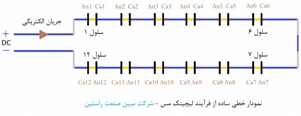 برای فهم ساده تر موضوع فرآیند الکترولیز مس ( یا هر محصول دیگر ) در شکل بالا توضیح داده شده است، همانطور که در این شکل مشخص شده است. جریان از طریق قطب مثبت با عبور از سلول ها به سمت قطب منفی (آند سربی) در جریان است. این شکل دارای 12 سلول می باشد. سلول های شماره 2 تا 5 و 8 تا 11 سلول های میانی یا intercell و سلول های 1-6-7 و 12 سلول های پایانی یا endcell ها می باشند